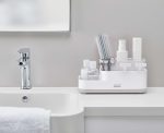 Compartimentarea practică îți permite să separi produsele pe categorii, iar designul este gândit pentru utilizare în medii umede. Baza permite scurgerea apei, astfel încât produsele se pot usca mai repede și se reduce acumularea de umezeală. Ușor de mutat și de curățat, este o soluție simplă pentru o baie mai organizată și mai plăcută vizual.