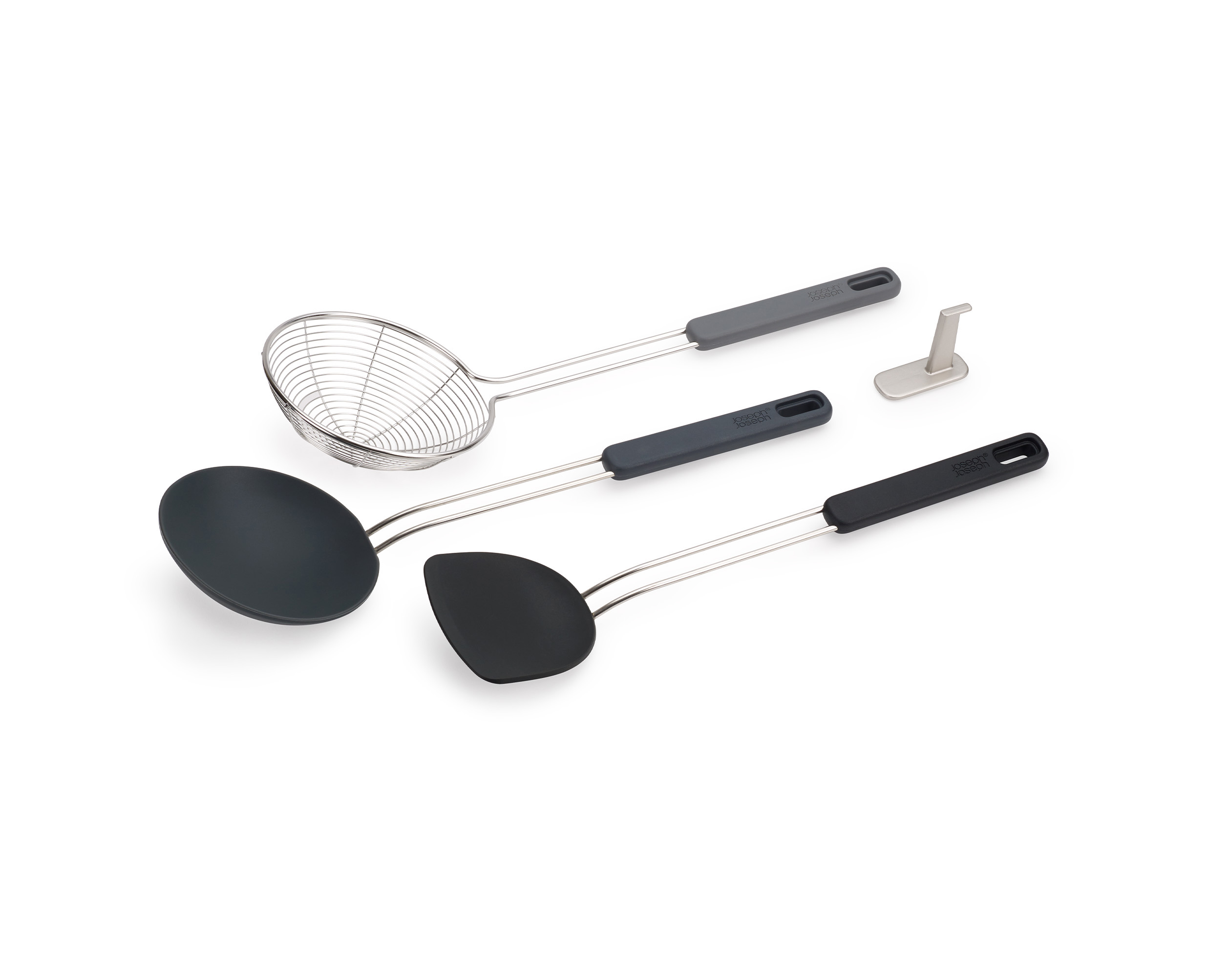 Acest set util de ustensile pentru wok include o spatulă din silicon, o lingură din silicon și un filtru din sârmă din oțel inoxidabil, toate cu mânere care se potrivesc împreună pentru depozitare eficientă a spațiului. De asemenea, este inclus un cârlig de agățat montat pe perete pentru acces convenabil.