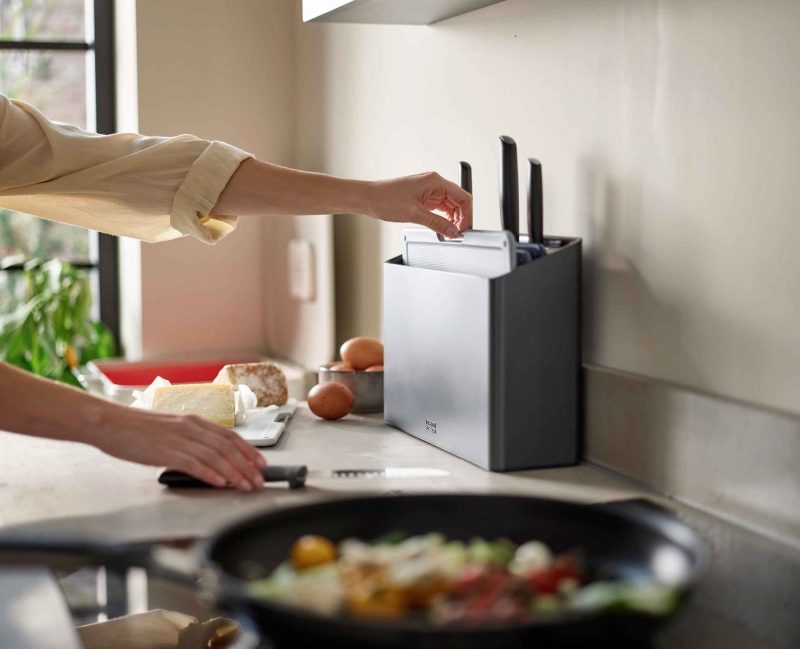 Folio™ Plus aduce împreună patru plăci de tăiat codificate cu culori diferite și patru cuțite corespunzătoare. Fiecare placă de tăiat oferă suprafețe de tăiere prietenoase cu cuțitul, bare de selectare din oțel inoxidabil și picioare anti-alunecare. Cele patru cuțite japoneze din oțel inoxidabil au suporturi integrate pentru unelte care ajută la îmbunătățirea igienei și minimizarea dezordinei atunci când cuțitul este așezat jos. Atât plăcile de tăiat, cât și cuțitele se depozitează în carcasa unghiulară, menținând blatul de lucru curat și ordonat și asigurându-se că ustensilele tale de tăiere sunt întotdeauna la îndemână.